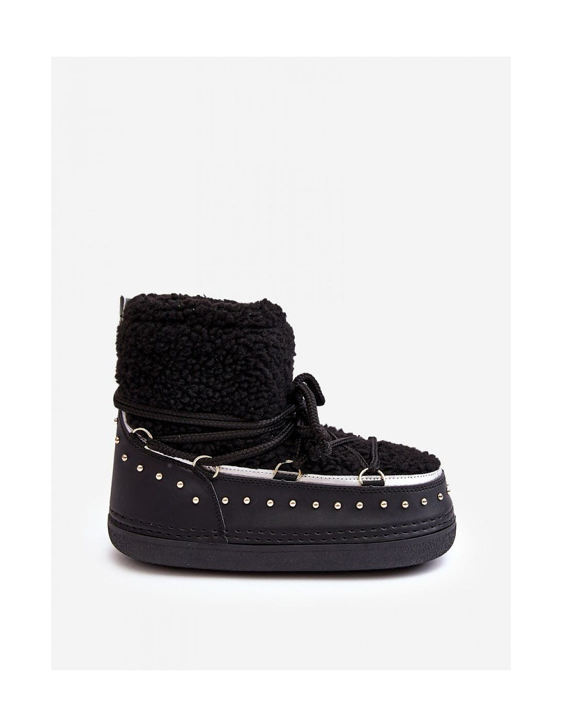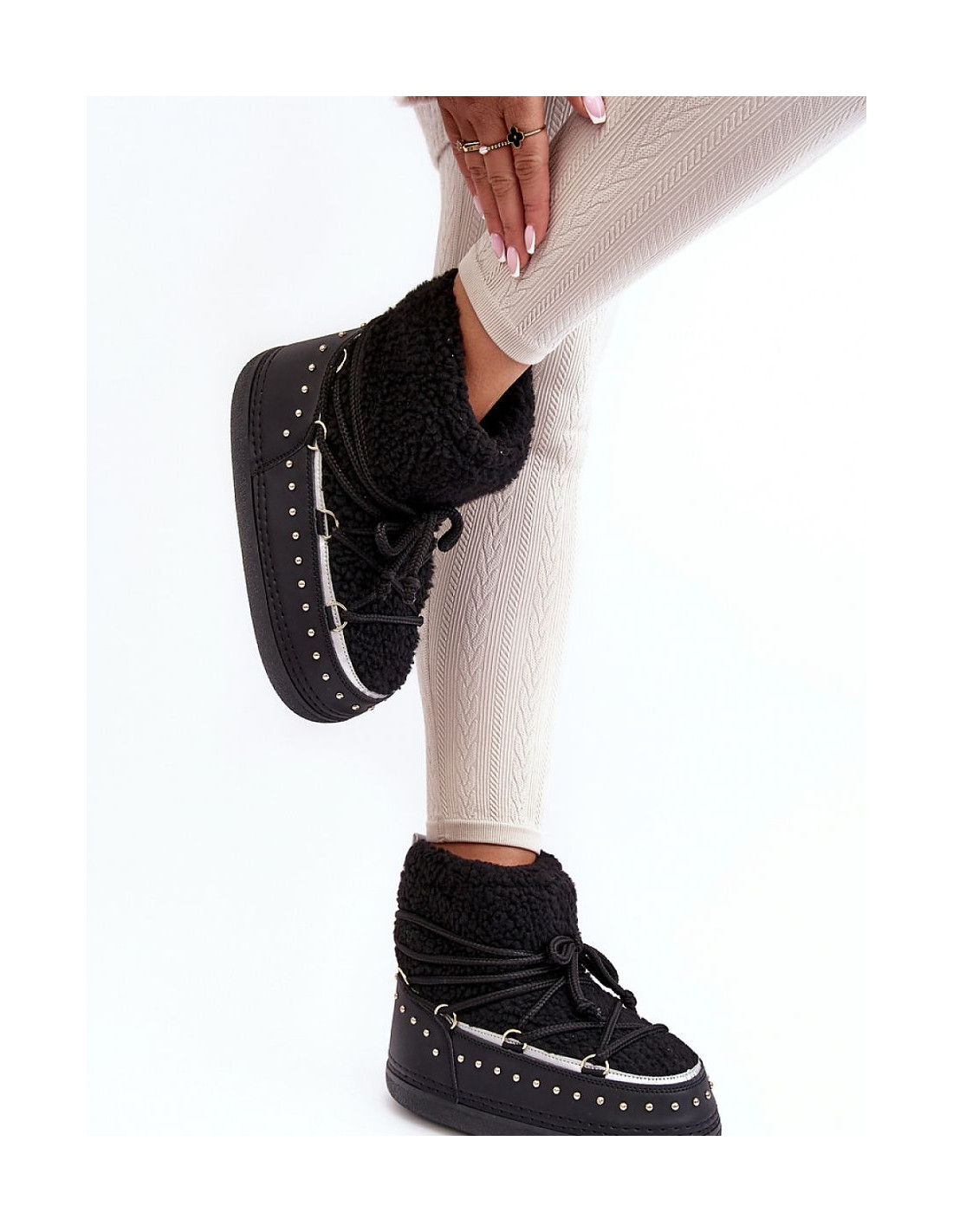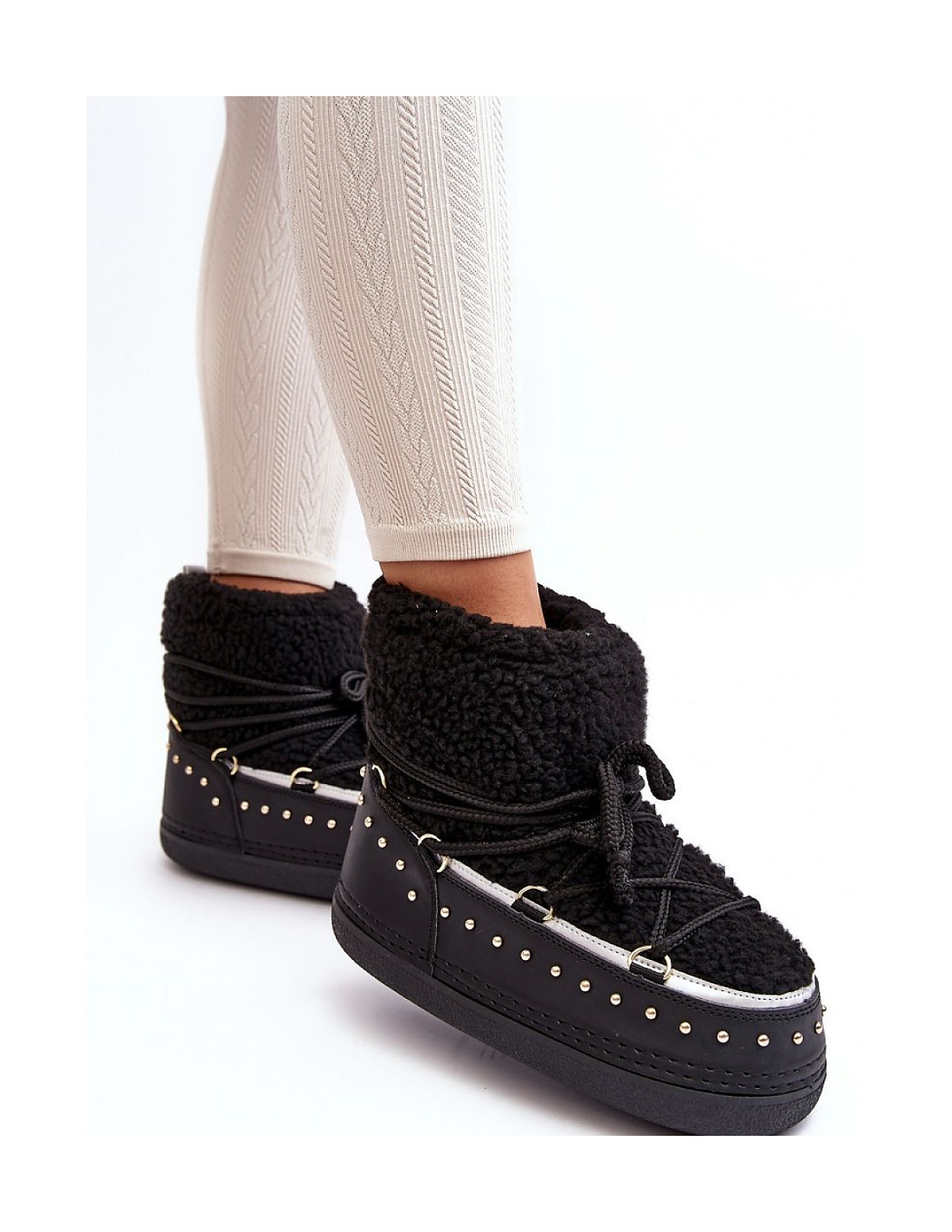Ces bottes de neige pour femmes sont fabriquées dans un matériau résistant au froid et au vent. La tige en fausse peau de mouton et les clous seront parfaits pour la saison automne-hiver. Modèle classique à enfiler avec laçage supplémentaire. Les bottes de neige ont été placées sur une plate-forme massive. Elles sont dotées d'une isolation intérieure sous forme de mousse et d'une couverture de chaussure, ce qui assure une protection élevée les jours de grand froid.