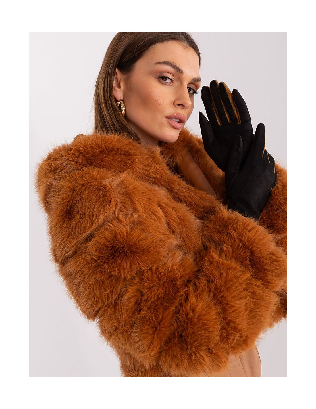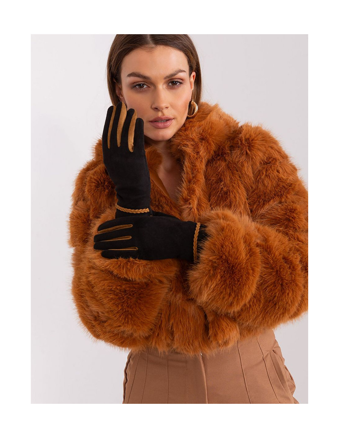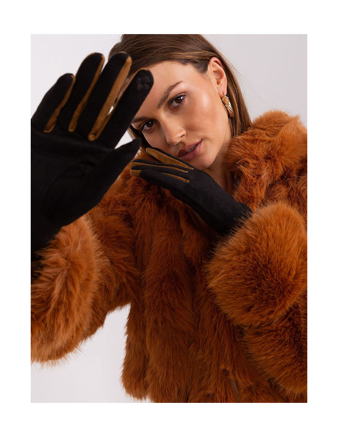 Élégants gants de femme en tissu lisse avec empiècements contrastés entre les doigts. Bretelles décoratives tressées contrastées aux poignets. Pouce et index avec fleur brodée, permettant d'utiliser le téléphone sans enlever les gants.