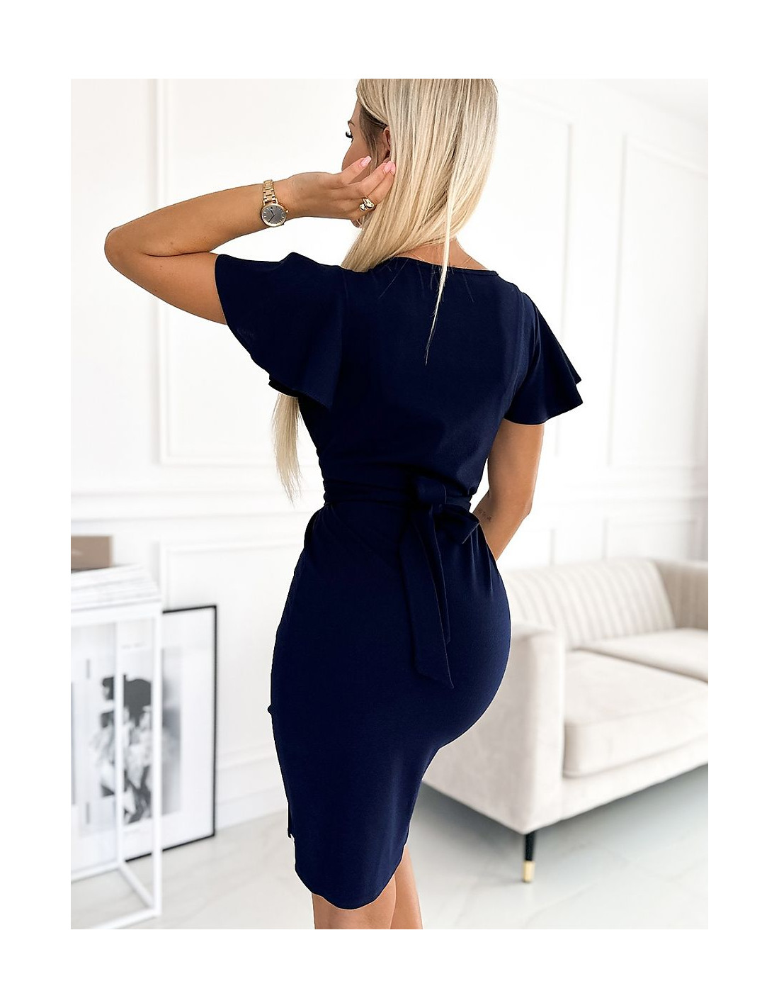 Robe avec encolure enveloppante, manches courtes, ceinture et fente sur la jambe. Confectionnée dans un tissu légèrement extensible de couleur bleu marine. Marque numoco. Produit polonais.