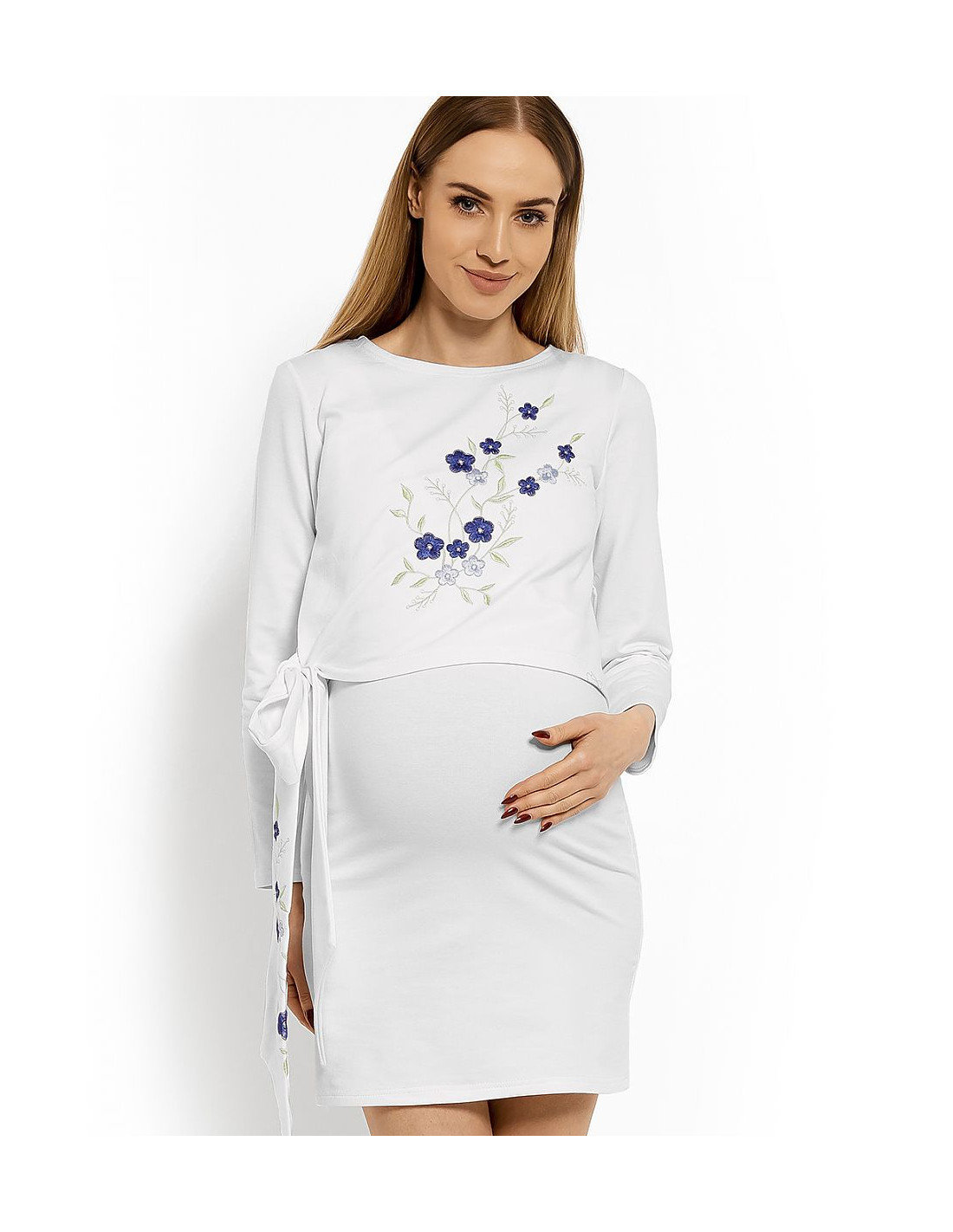 Robe tunique ajustée. Deux couches pour un allaitement discret. Broderie florale. Ceinture nouée sur le côté. Peut également être porté après une grossesse. Coton de haute qualité.