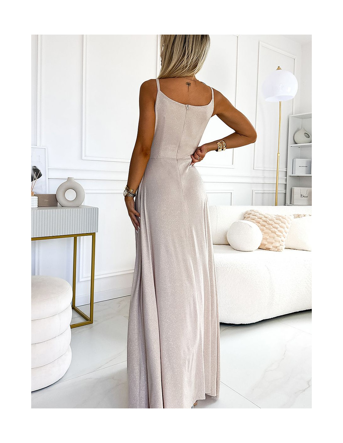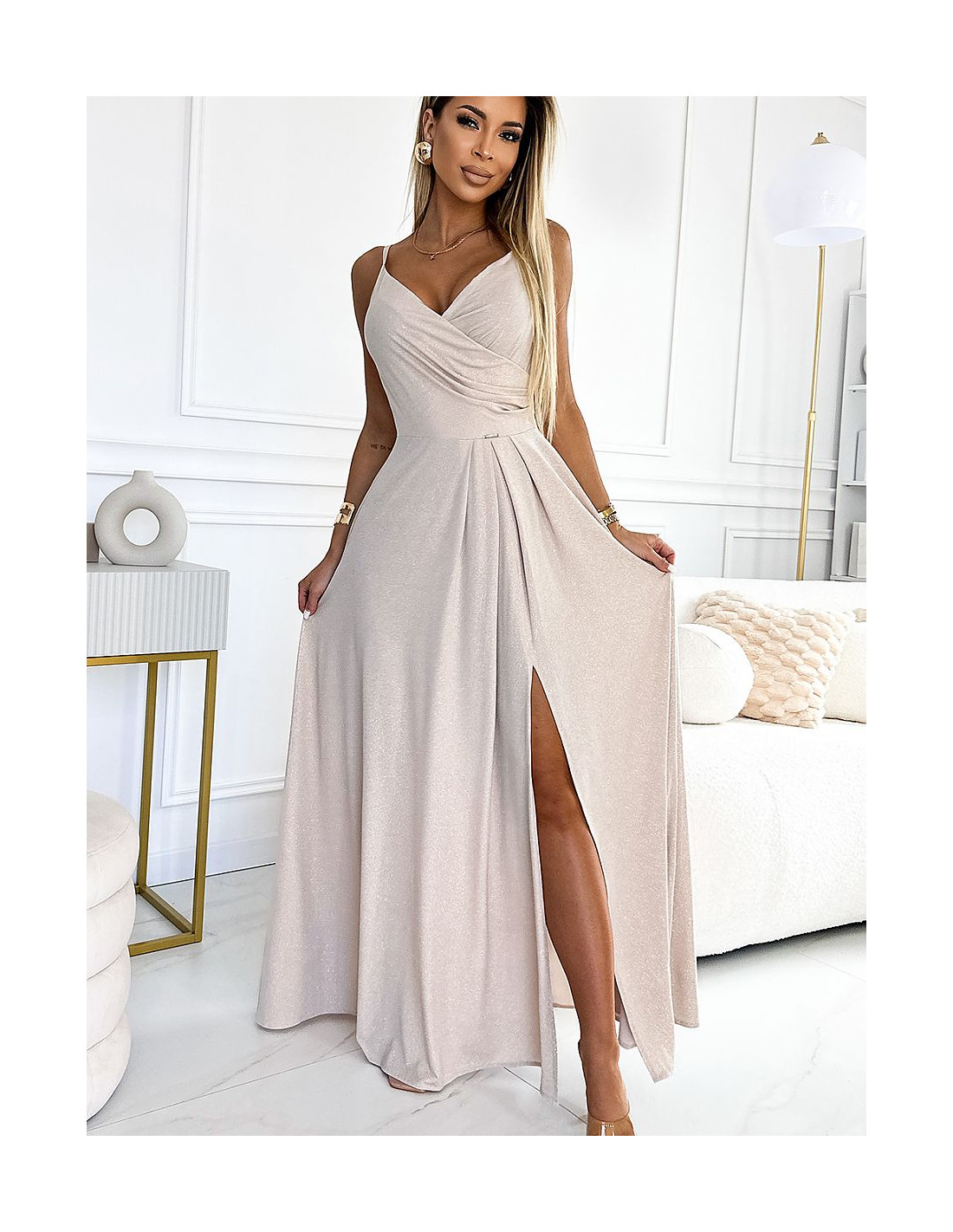 Élégante robe bustier longue et scintillante. L'encolure joliment formée et la fente sur la jupe créent une composition inhabituelle. Fabriquée en brocart extensible de couleur beige. Une robe parfaite pour les mariages, les réveillons, les bals de fin d'année, les carnavals et d'autres occasions plus importantes. Fabriquée en Pologne. Marque Numoco.