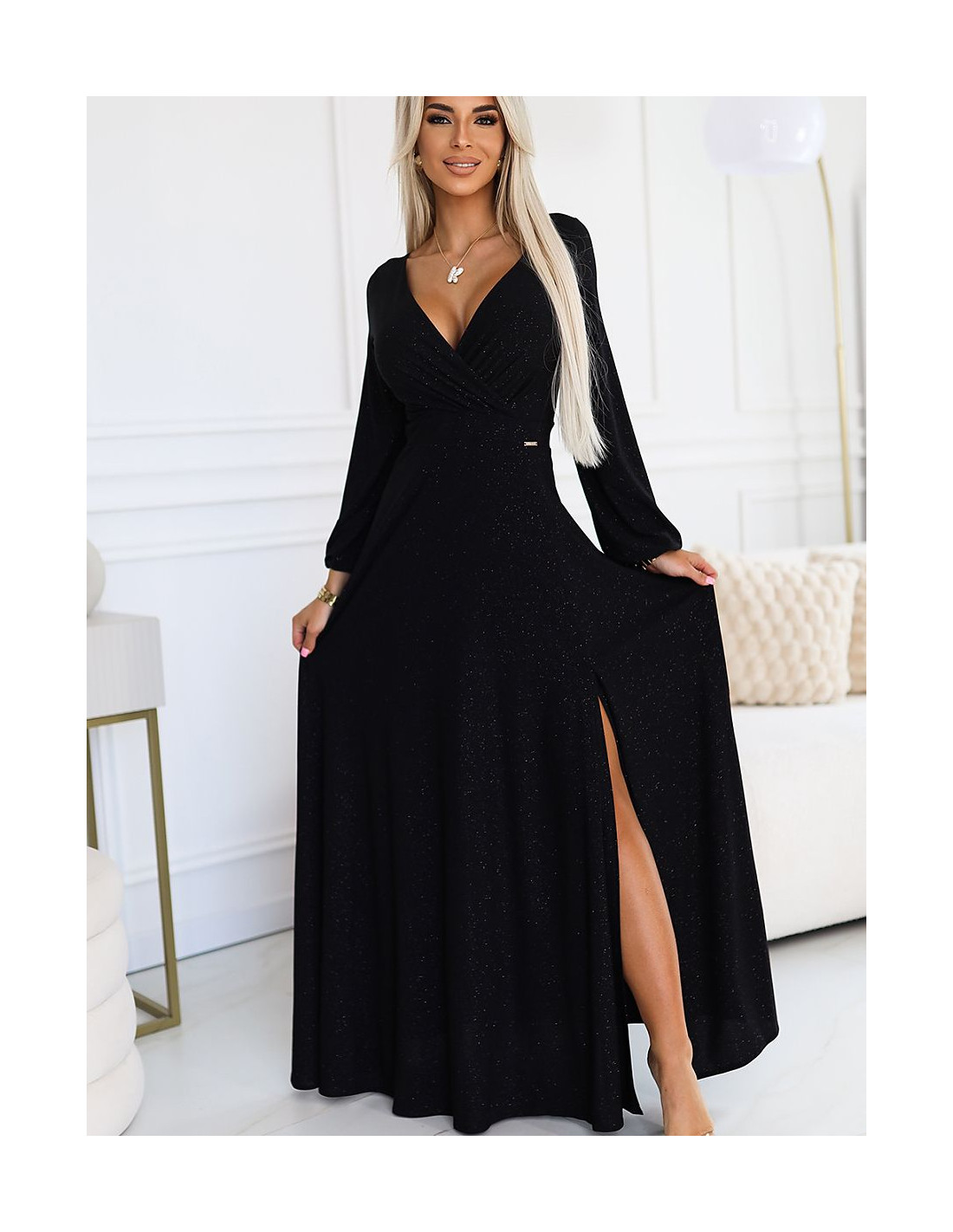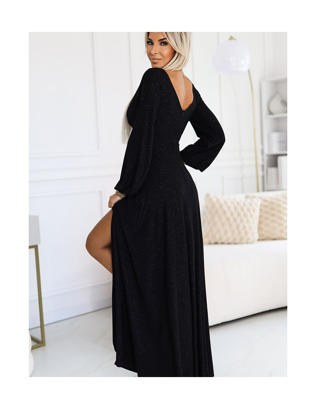 La robe NELA de la marque Numoco est une élégante création longue avec une fente sur la jambe et des manches longues amples. La robe a un décolleté en V à l'avant et un décolleté sensuel dans le dos. Fabriquée dans un matériau élastique noir brillant qui met parfaitement en valeur la silhouette. Produit polonais, idéal pour les occasions spéciales.