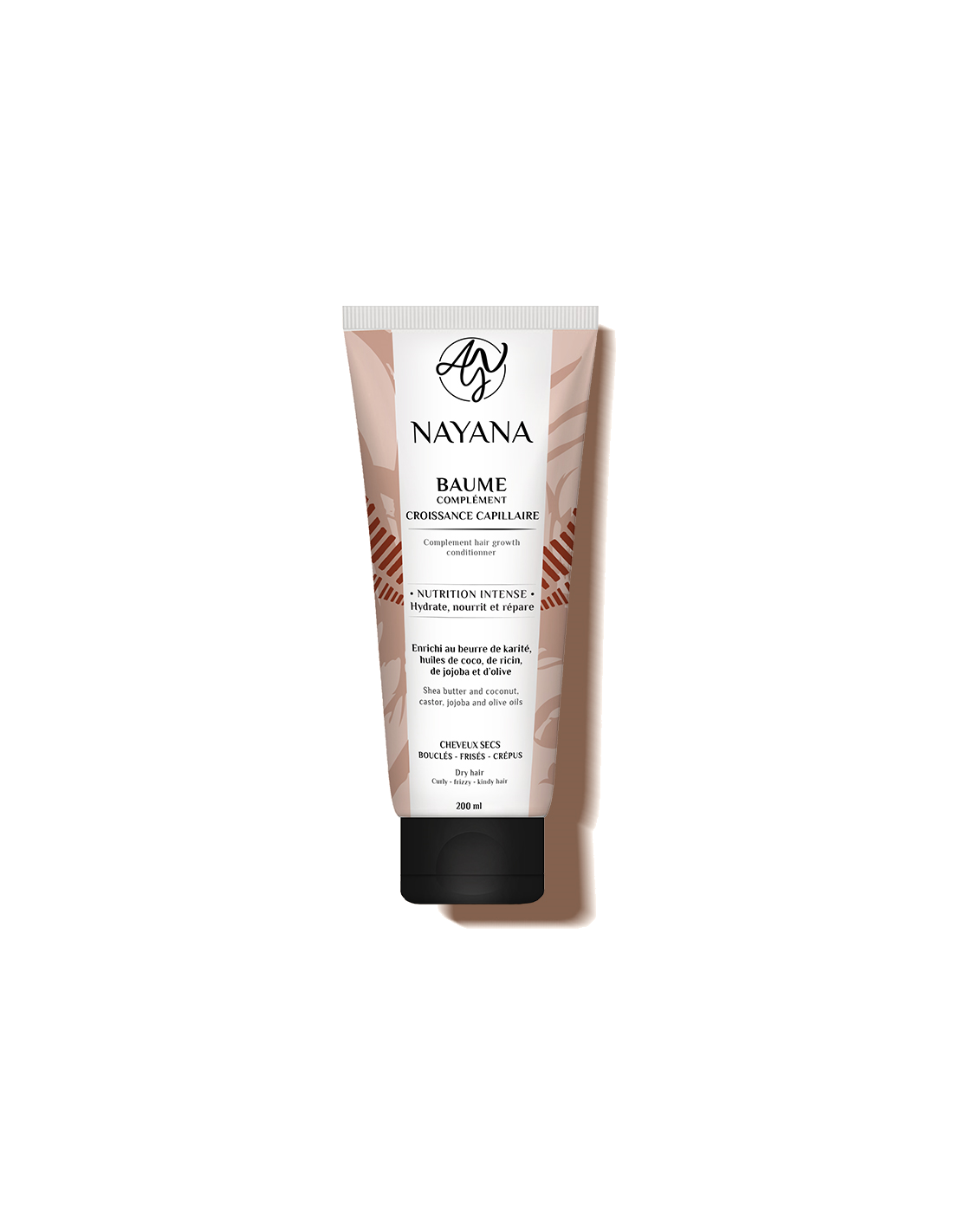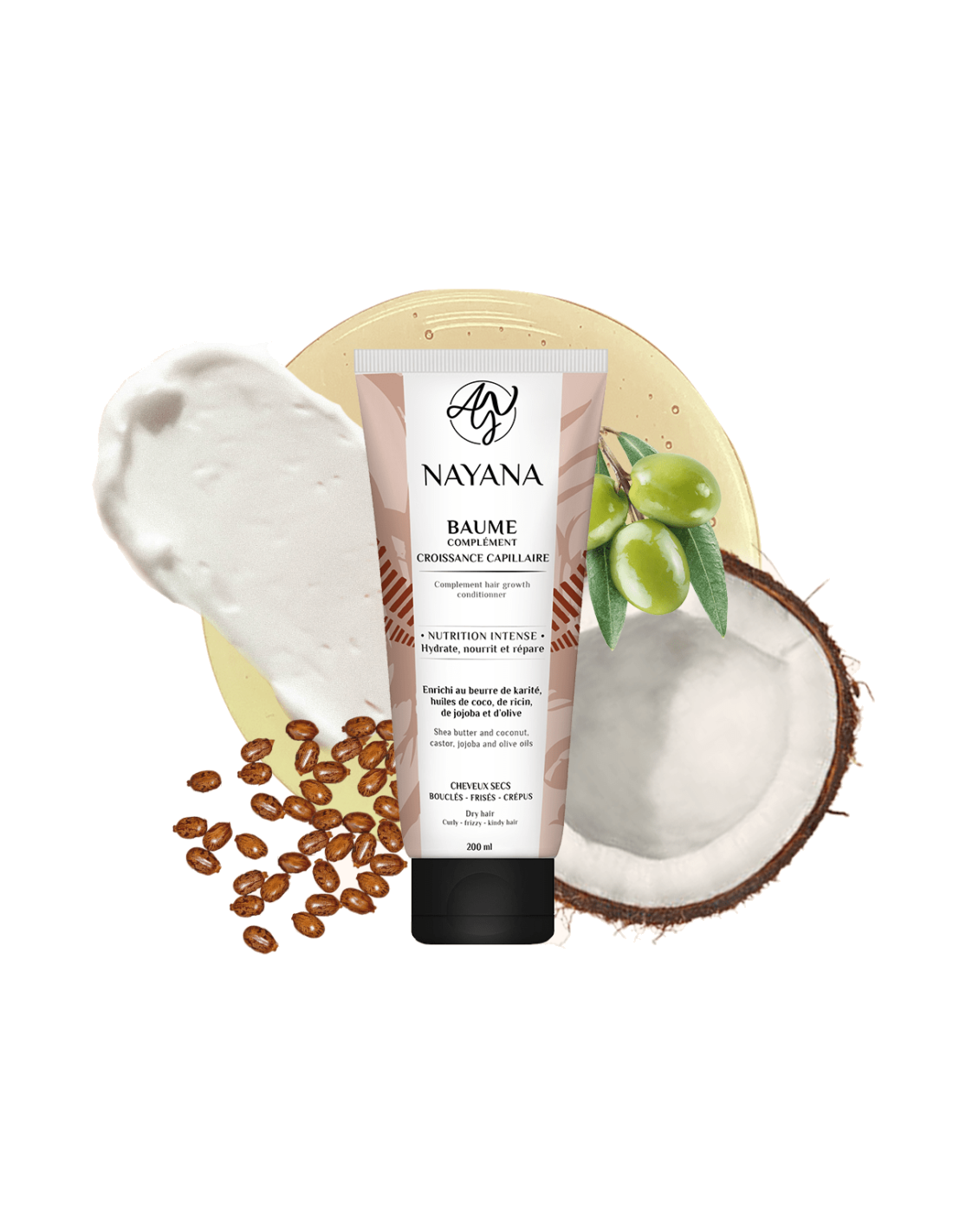Le shampooing complement de croissance capillaire Nayana est un soin intensif dedie aux cheveux secs, frises, crepus. Il est enrichi aux huiles de coco, de jojoba, de ricin, de beurre de karite et de l'actif BaicapilTM. Il transforme les cheveux tristes et ternes, en une chevelure sans frisottis, faciles à démêler, hydratée, réparée, brillante et forte.